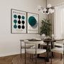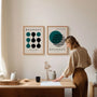 This Set of 2 wall art prints is designed for lovers of minimalist geometry, combining deep green and black shapes into a rhythmic, Bauhaus-inspired composition. Repeating circles, organic forms, and precise layouts create a modern abstract look that feels structured yet expressive. A light, neutral background highlights the bold colours, making the set an easy fit for living rooms, offices, studios, and creative spaces. Elegant and graphic, these prints bring visual order and timeless modernist character. Display them as coordinated framed posters or choose premium unframed prints for a crisp, gallery-style finish.