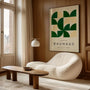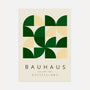 This Bauhaus-style poster features a clean geometric arrangement of semicircles and squares in calming shades of green and beige. The harmonious layout combines simple forms with refined color, capturing the balanced proportions and modernist spirit that define Bauhaus design.