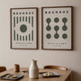 This Set of 2 Bauhaus green posters blends modernist geometry with a muted, elegant palette. Rhythmic circles, simple forms, and balanced symmetry create wall art with a timeless, design-led character. Shades of green—from deep olive to softened, earthy tones—bring a calm, grounded atmosphere that works beautifully in contemporary spaces.