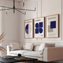 This Set of 3 wall art prints explores Bauhaus colour-and-form balance through clean geometry. Circles, half-circles, rectangles, and linear divisions create calm, modern compositions in deep navy and light beige.