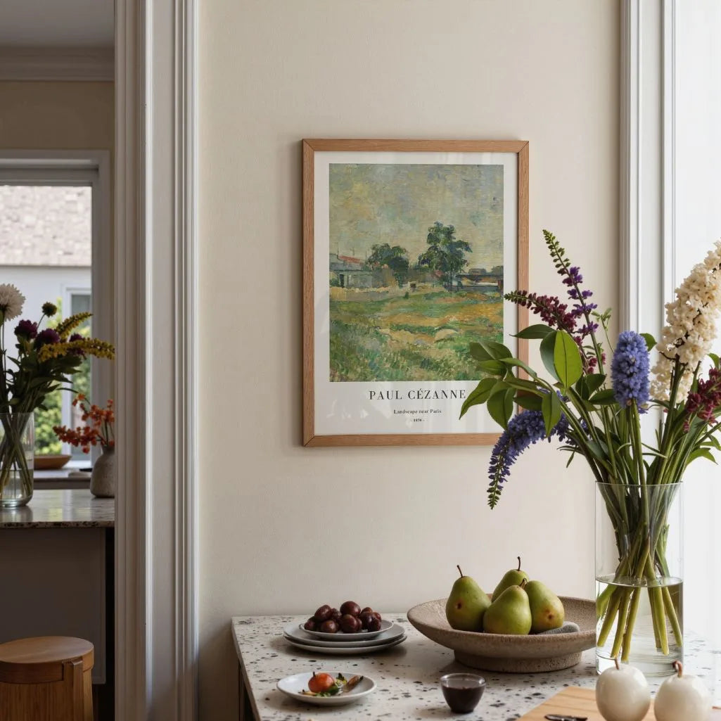 Bring a touch of early Cézanne into your home with Landscape near Paris, a beautifully balanced scene where light and color shape a calm view of the Paris outskirts. This portrait-format wall art captures a living rhythm of nature through soft tones and structured brushwork—an elegant blend of impressionist atmosphere and Cézanne’s emerging sense of form.