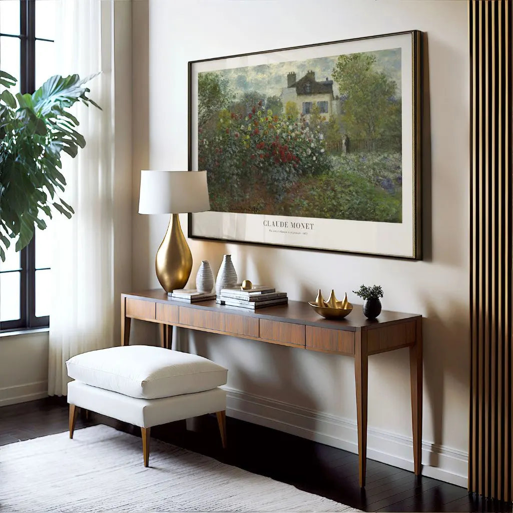 This Claude Monet poster features The Artist’s Garden in Argenteuil (1873), a luminous celebration of color, light, and everyday beauty. Painted in Monet’s own garden, the scene feels like an invitation into his private refuge—where abundant flowers fill the space with life and movement. In the foreground, dahlias bloom in vivid reds, pinks, and yellows, set against softer tones of the house beyond, all wrapped in gentle, diffused light.