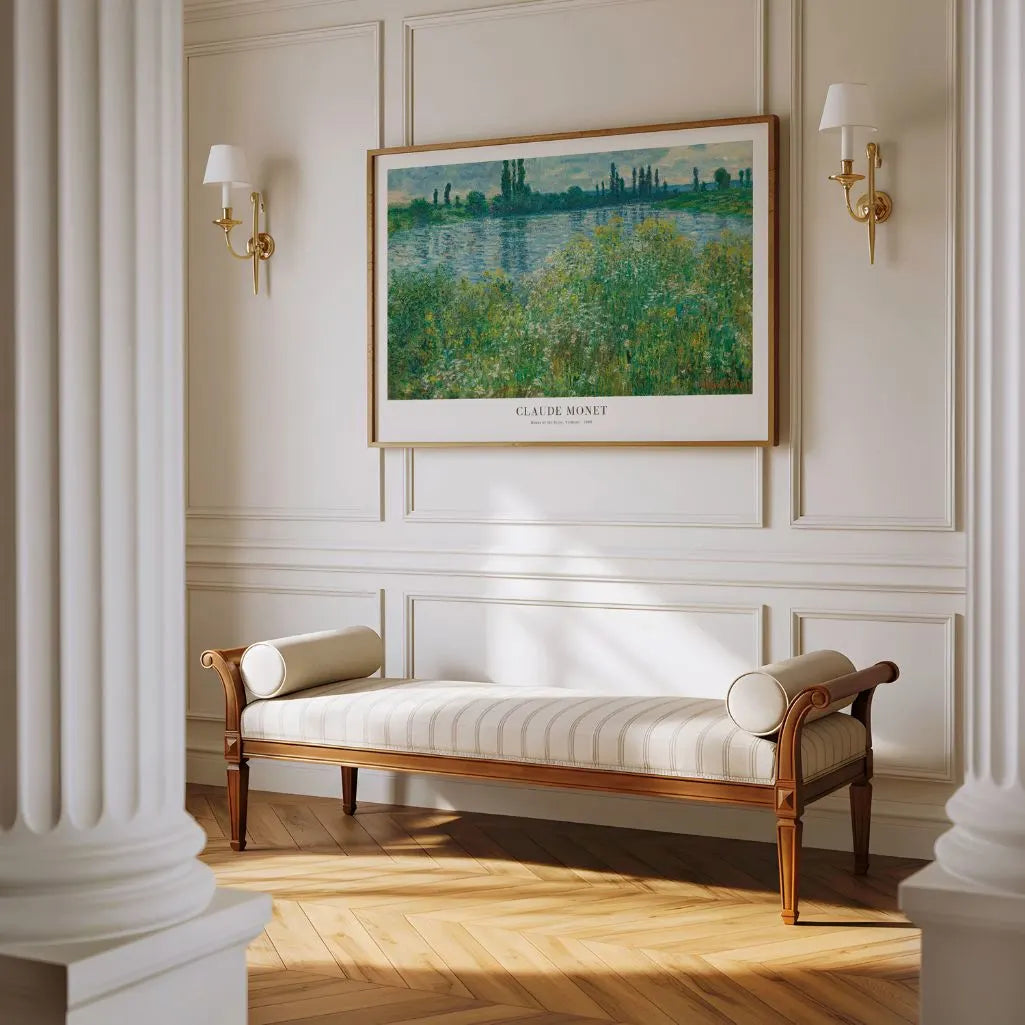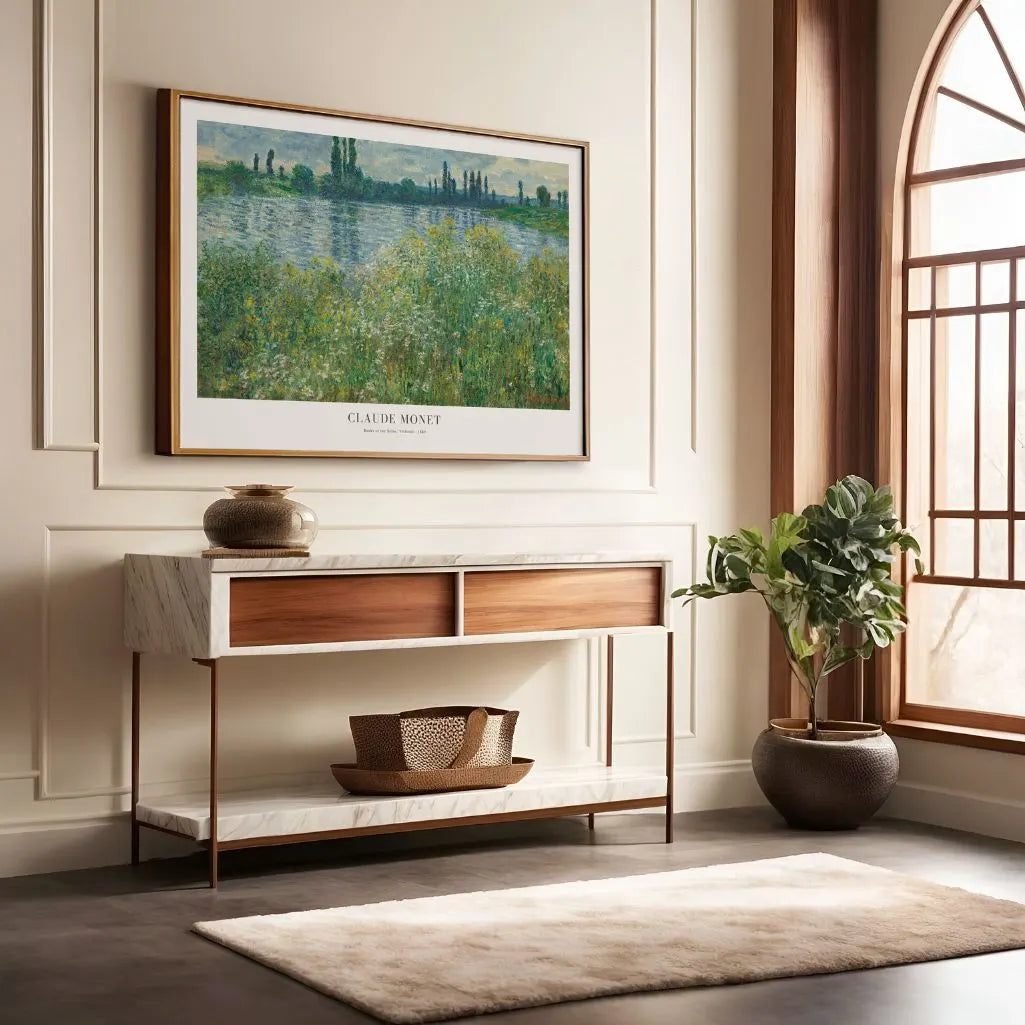 Bring a touch of French countryside serenity to your space with this Claude Monet Banks of the Seine, Vétheuil poster. Lush riverside greenery, airy brushwork, and shimmering reflections create classic impressionist wall art that feels fresh, light, and timeless.