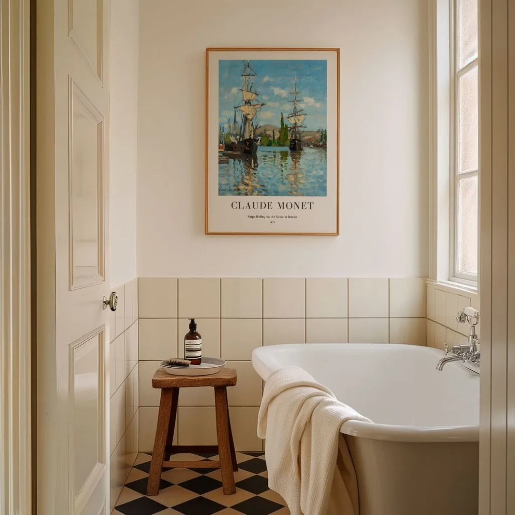 Bring a calm, luminous scene to your home with this Claude Monet Ships Riding on the Seine at Rouen poster. Moored boats rest on the quiet river as soft morning light skims the water, creating delicate reflections and gentle color shifts—timeless impressionist wall art with an airy, peaceful mood.