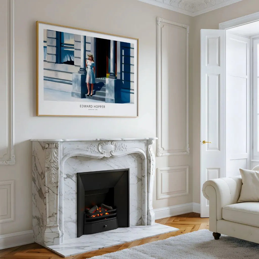 This Edward Hopper poster reproduces the iconic painting Summertime (1943) in a horizontal format, capturing a quiet moment of stillness and light. A solitary woman standing in the sun on the steps of a city townhouse becomes a poetic study of everyday life, where silence, warmth, and reflection take center stage. Hopper’s masterful use of light and shadow gives this wall art its timeless emotional depth.