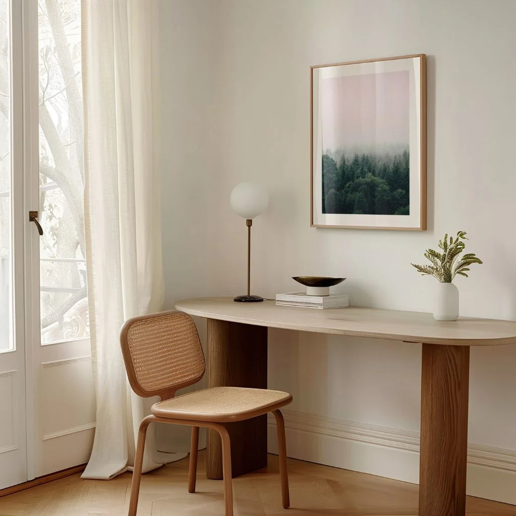 This serene wall art captures a dense green forest wrapped in soft mist beneath a pastel, pink-tinted sky. The gentle composition blends freshness, balance, and minimalism, creating a soothing atmosphere inspired by quiet moments in nature.