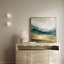 Bring a sense of quiet balance into your space with this framed canvas print, Green Valley in Sunlight. A gentle mountain valley drifts through soft mist, blending natural greens with warm beige and muted ochre tones to create a soothing, sunlit depth. The result feels airy and grounded—perfect for interiors styled in boho, japandi, scandi, or eco-minimalist decor. Ready to hang, this framed canvas print adds a warm, natural focal point to a living room, bedroom, office, or hospitality space, inviting everyday calm and comfort.