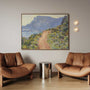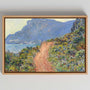 Bring the warmth of the French Riviera into your space with this framed canvas print of Claude Monet’s La Corniche near Monaco (1884). Painted during his journey through southern France, the scene captures Mediterranean light in motion—rocky coastline, shimmering blues of the sea, and soft pastel tones across sky and vegetation. The composition guides the eye along a sandy path that winds through hillside greenery toward distant, sunlit slopes.