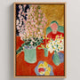 Bring vibrant, decorative energy into your space with this framed canvas print of Henri Matisse’s Plum Blossoms (1948). The composition features a lush bouquet arranged on a red table, surrounded by vessels and fruit, with a simplified figure shape in the background. Matisse’s late style shines through in confident blocks of color and reduced forms, creating a modern rhythm that feels both playful and beautifully composed.