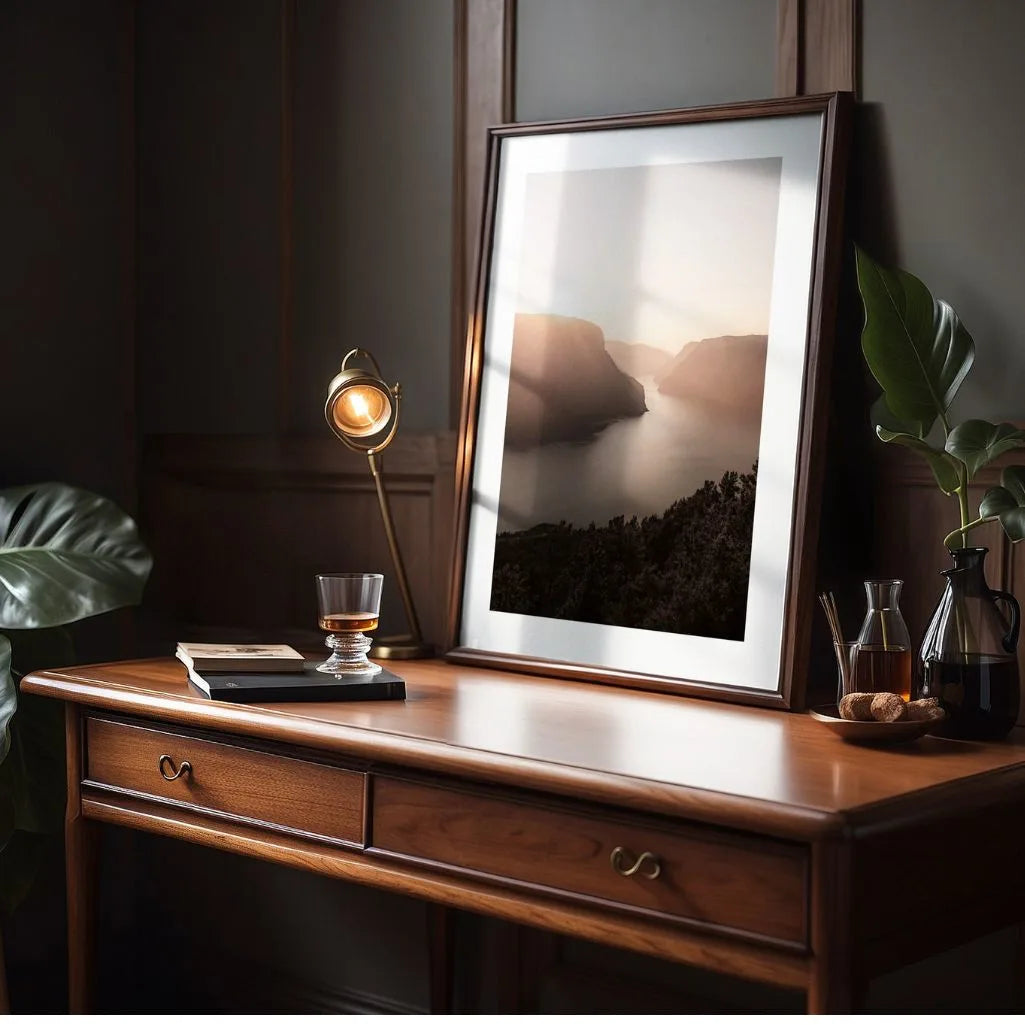 This serene wall art captures a majestic fjord bathed in the gentle light of sunrise. Soft rays illuminate the mountains and calm water, creating a peaceful, almost meditative atmosphere inspired by the quiet beauty of the natural world.