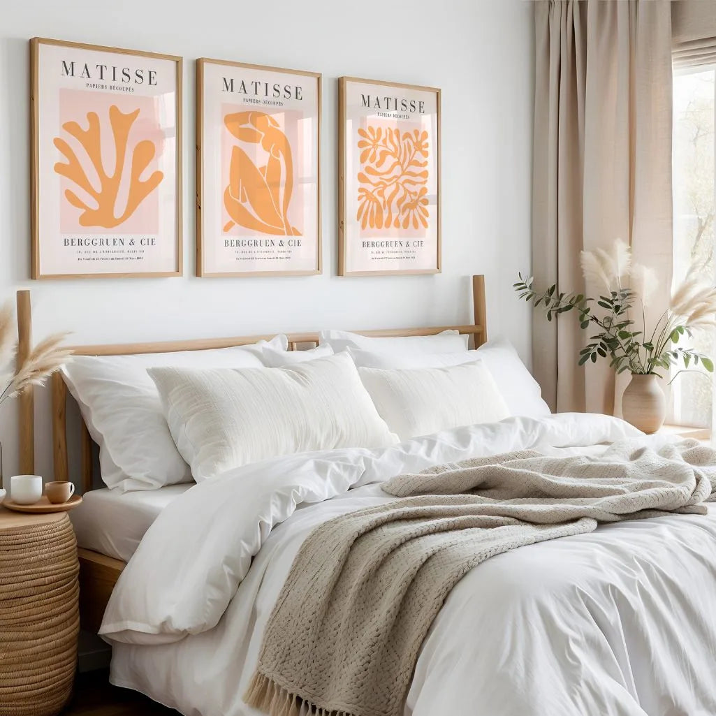 This Set of 3 wall art prints is inspired by Henri Matisse’s celebrated cut-out technique, featuring soft paper-cut shapes with flowing lines and a relaxed modernist rhythm. Abstract leaves, flowers, and plant-like silhouettes create decorative yet balanced compositions.