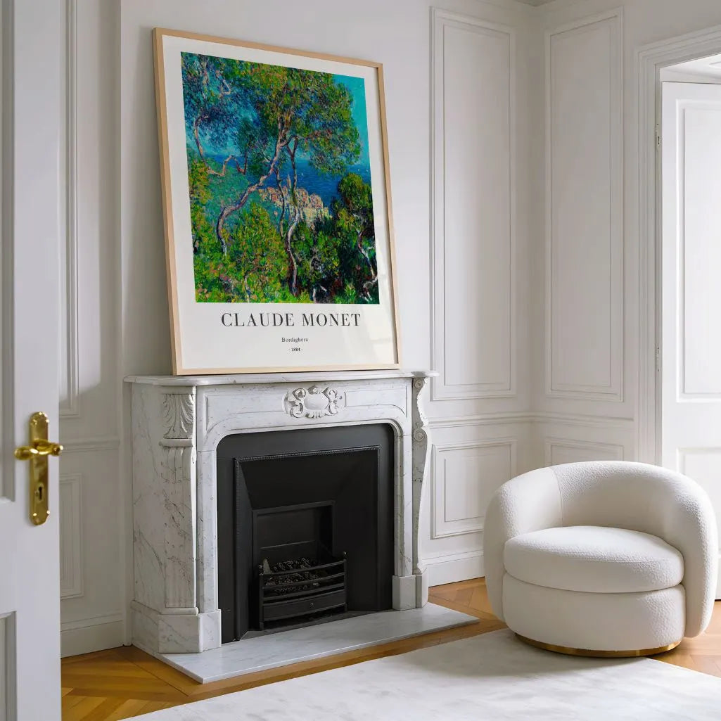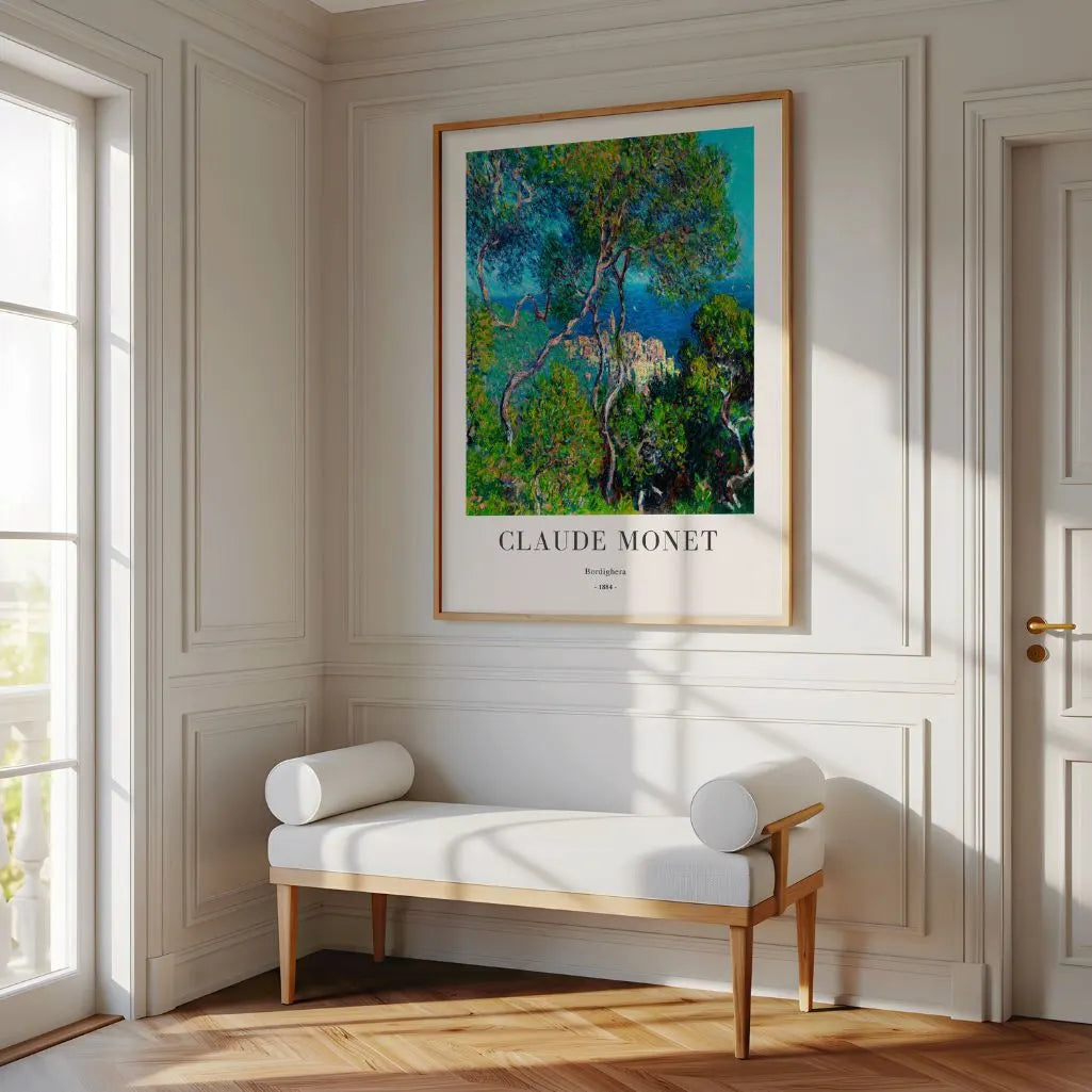 This Claude Monet poster features Bordighera (1884), a sunlit Mediterranean landscape painted on the Italian coast. Bordighera appears nestled in lush greenery and olive trees, with the blue sea stretching out in the distance—creating wall art that feels vibrant, warm, and full of open-air energy.