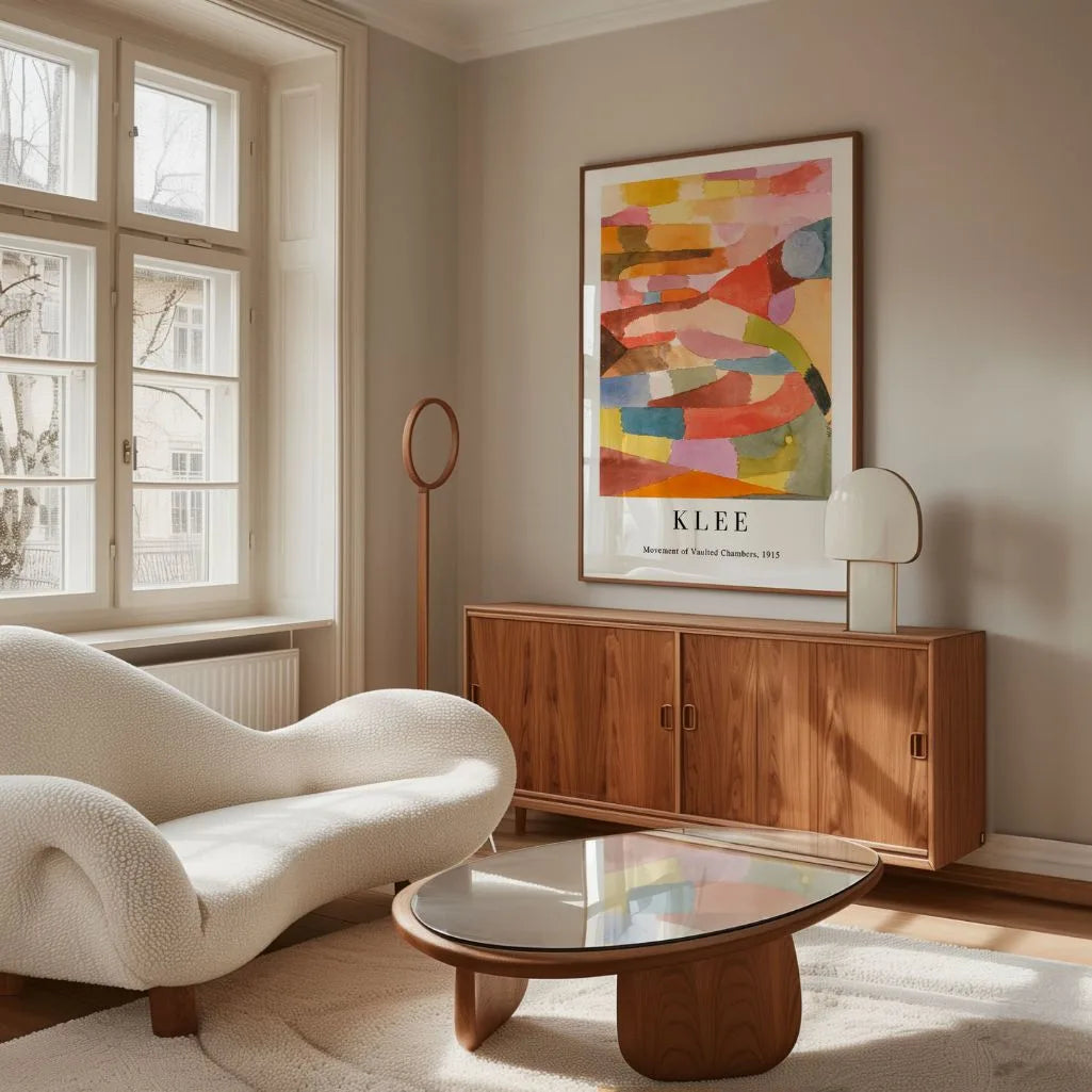 This refined wall art showcases Paul Klee’s unique vision of rhythm and space through abstract architecture and flowing forms. Inspired by music and structure, the composition brings a sense of movement and quiet energy into the room. Soft organic shapes and a balanced color palette create a calm yet expressive visual experience.