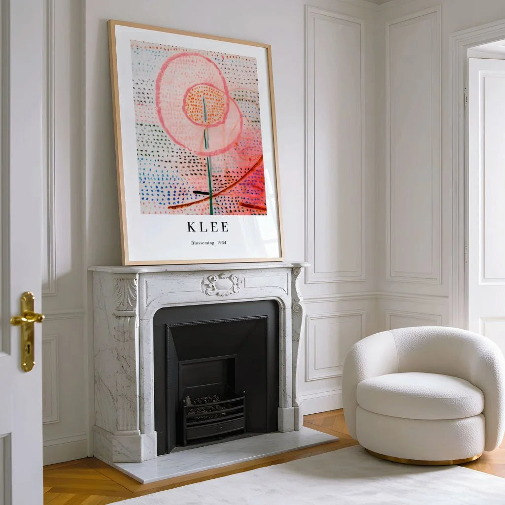 Paul Klee’s Blossoming (1934) is a gentle, symbolic vision of growth—an unfolding flower rendered through delicate color and rhythmic mark-making. Soft pinks and warm oranges blend into an airy composition, while subtle dotted textures add movement and quiet harmony. The result feels poetic and calming, bringing a sense of warmth and optimism without overwhelming your space. This wall art suits modern, scandi, and minimalist interiors, adding a refined artistic touch to a living room, bedroom, or creative corner. Available as a framed poster or an unframed print.